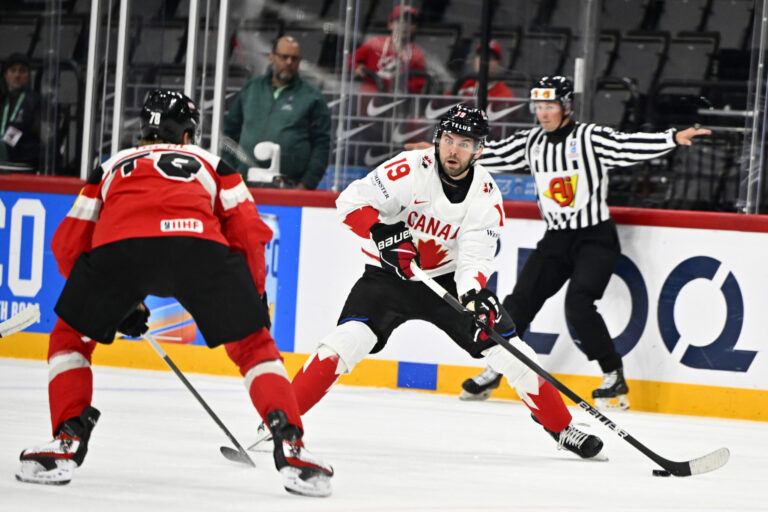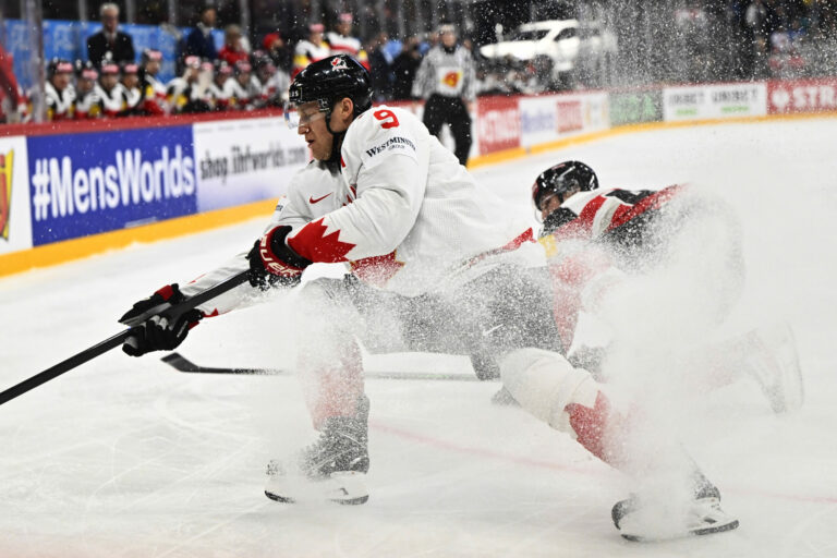 Kanadský útočník Adam Fantilli počas zápasu proti Rakúsku v základnej A-skupine na MS v hokeji 2025. Štokholm (Avicii Arena), 15. máj 2025. Foto: Anders Wiklund/TT News Agency via AP.