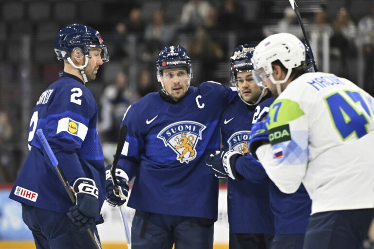 Fínsky kapitán Mikko Lehtonen sa so spoluhráčmi teší zo svojho gólu na 1:0 v zápase proti Slovinsku v základnej A-skupine na MS v hokeji 2025. Štokholm (Avicii Arena), 15. máj 2025. Foto: Anders Wiklund/TT News Agency via AP.