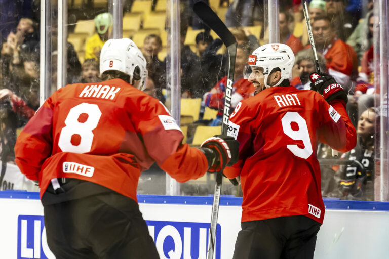 Švajčiarsky útočník Damien Riat sa so spoluhráčmi teší zo svojho gólu na 1:0 v zápase proti Nemecku v základnej B-skupine na MS v hokeji 2025. Herning (Jyske Bank Boxen), 15. máj 2025. Foto: Salvatore Di Nolfi/Keystone via AP.