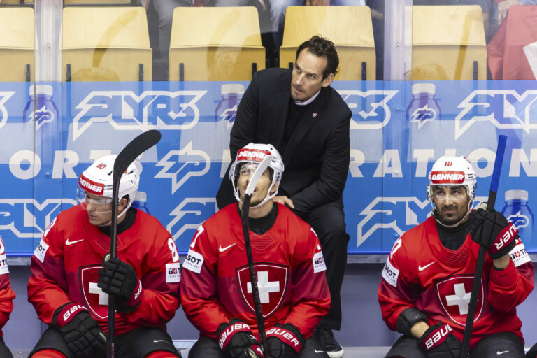 Švajčiarsky tréner Patrick Fischer počas zápasu proti Nemecku v základnej B-skupine na MS v hokeji 2025. Herning (Jyske Bank Boxen), 15. máj 2025. Foto: Salvatore Di Nolfi/Keystone via AP.