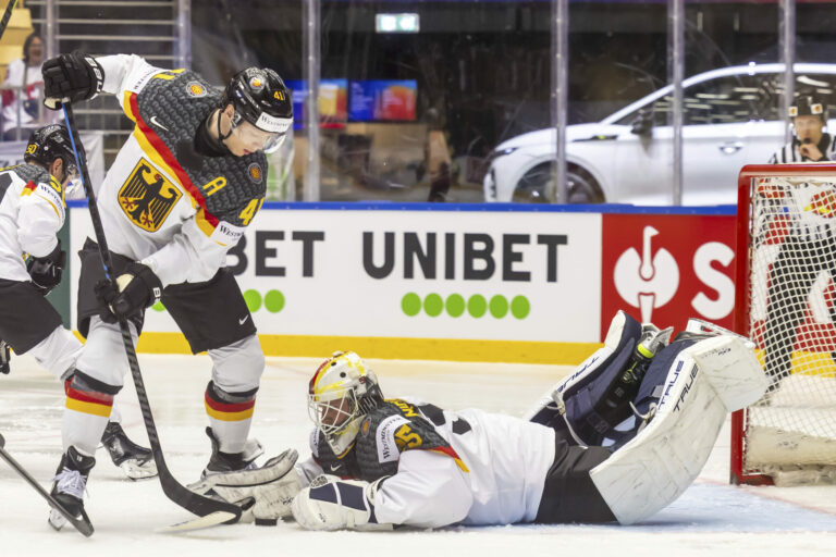 Zákrok nemeckého brankára Mathiasa Niederbergera v zápase proti Švajčiarsku v základnej B-skupine na MS v hokeji 2025. Herning (Jyske Bank Boxen), 15. máj 2025. Foto: Salvatore Di Nolfi/Keystone via AP.