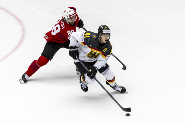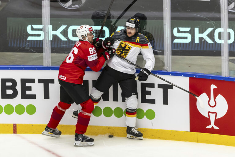 Švajčiarsky obranca Jerome Moser v súboji s nemeckým útočníkom Marcom Michaelisom v zápase základnej B-skupiny na MS v hokeji 2025. Herning (Jyske Bank Boxen), 15. máj 2025. Foto: Salvatore Di Nolfi/Keystone via AP.