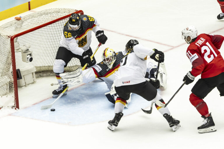 Zákrok nemeckého brankára Mathiasa Niederbergera po zakončení švajčiarskeho útočníka Kevina Fialu v zápase základnej B-skupiny na MS v hokeji 2025. Herning (Jyske Bank Boxen), 15. máj 2025. Foto: Salvatore Di Nolfi/Keystone via AP.