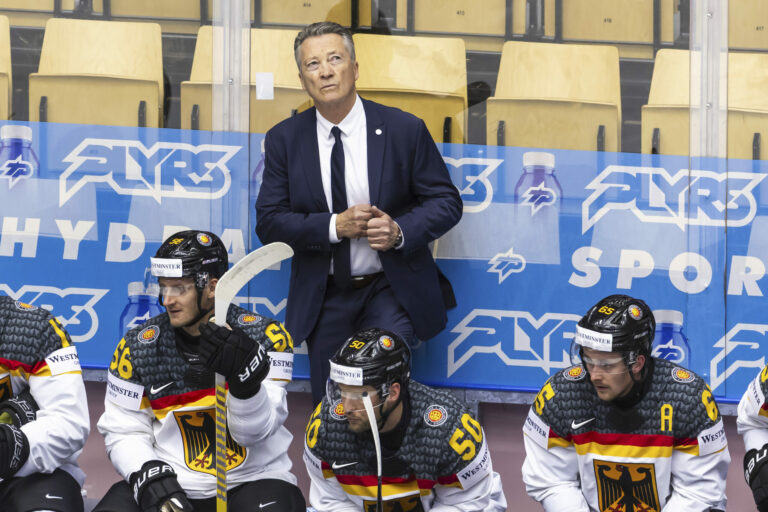 Nemecký tréner Harold Kreis počas zápasu proti Švajčiarsku v základnej B-skupine na MS v hokeji 2025. Herning (Jyske Bank Boxen), 15. máj 2025. Foto: Salvatore Di Nolfi/Keystone via AP.