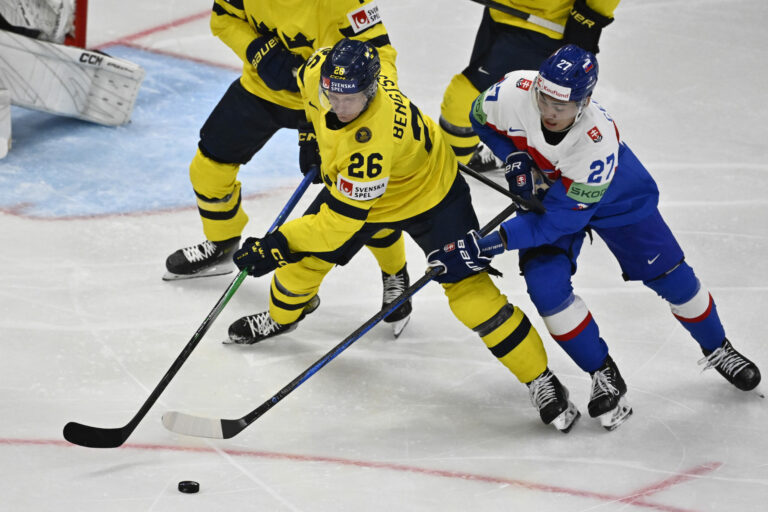 Slovenský obranca Michal Beňo sa snaží obrať o puk švédskeho útočníka Lea Carlssona počas zápasu základnej A-skupiny na MS v hokeji 2025. Štokholm (Avicii Arena), 9. máj 2025. Foto: Christine Olsson/TT News Agency via AP.