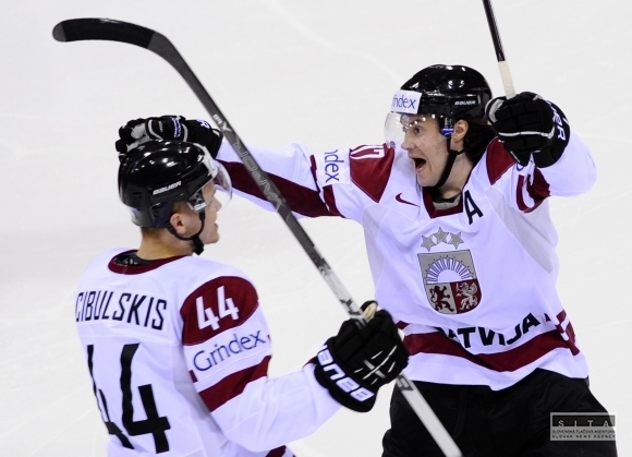 Sprava: Radosť Aleksandrs Nizivijs a Oskars Cibulskis z Lotyšska po góle Martins Cipulis počas zápasu základnej D - skupiny Dánsko - Lotyšsko na 75. hokejových majstrovstvách sveta 2011 IIHF v Bratislave. Bratislava, 4. máj 2011. Foto: SITA/Marián Peiger