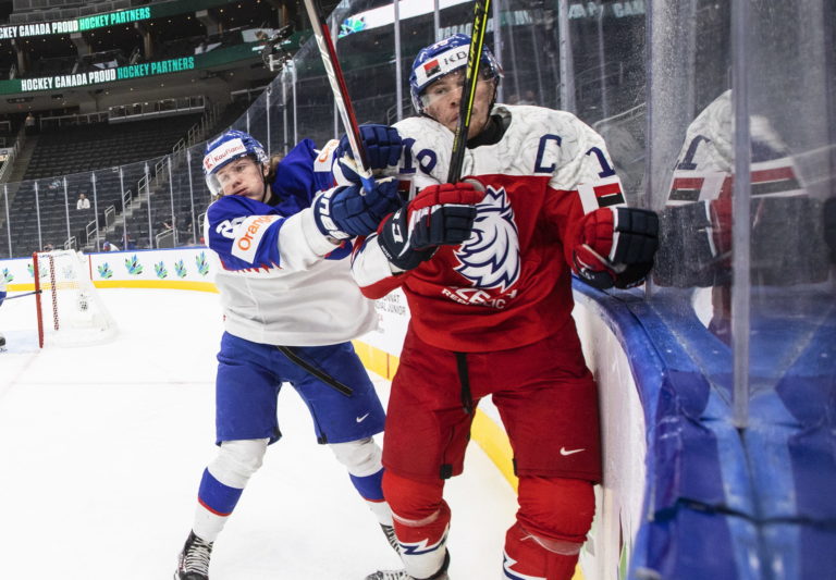 Slovenský obranca Šimon Groch a český reprezentant Martin Ryšavý počas zápasu A-skupiny na MS v hokeji do 20 rokov. Edmonton (Rogers Place), 9. august 2022. Foto: Jason Franson/The Canadian Press via AP.