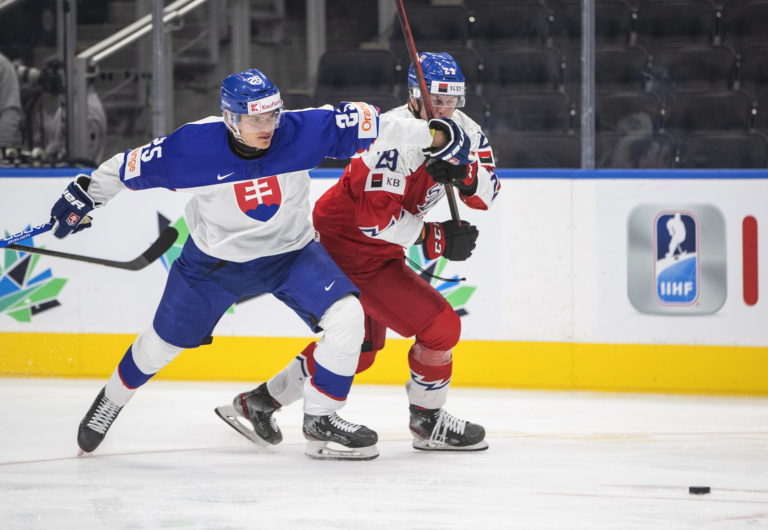 Český útočník Matouš Menšík a slovenský reprezentant Boris Žabka počas zápasu A-skupiny na MS v hokeji do 20 rokov. Edmonton (Rogers Place), 9. august 2022. Foto: Jason Franson/The Canadian Press via AP.