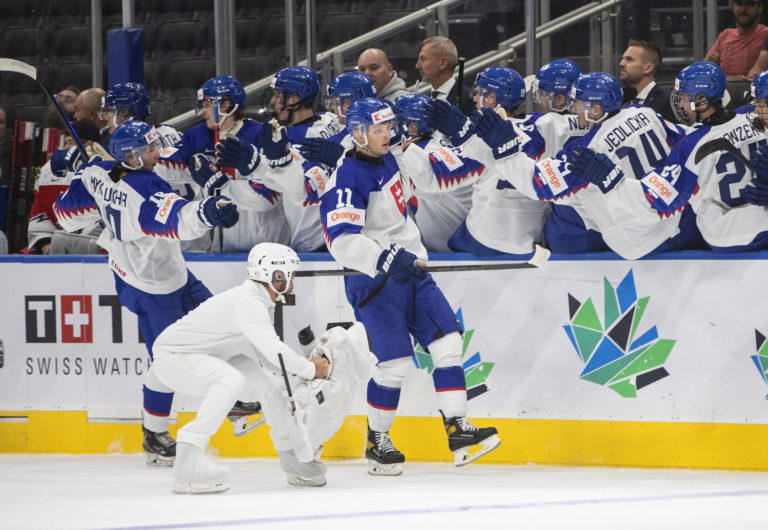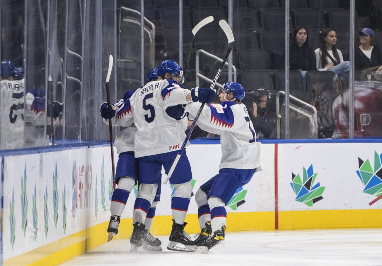 Slovenskí reprezentanti sa tešia z gólu v sieti Česka počas zápasu A-skupiny na MS v hokeji do 20 rokov. Edmonton (Rogers Place), 9. august 2022. Foto: Jason Franson/The Canadian Press via AP.