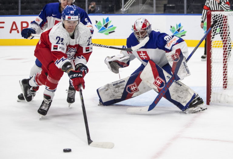 Český útočník Jiří Kulich v súboji so Slovákom Denisom Bakalom v bránkovisku Šimona Latkóczyho počas zápasu A-skupiny na MS v hokeji do 20 rokov. Edmonton (Rogers Place), 9. august 2022. Foto: Jason Franson/The Canadian Press via AP.