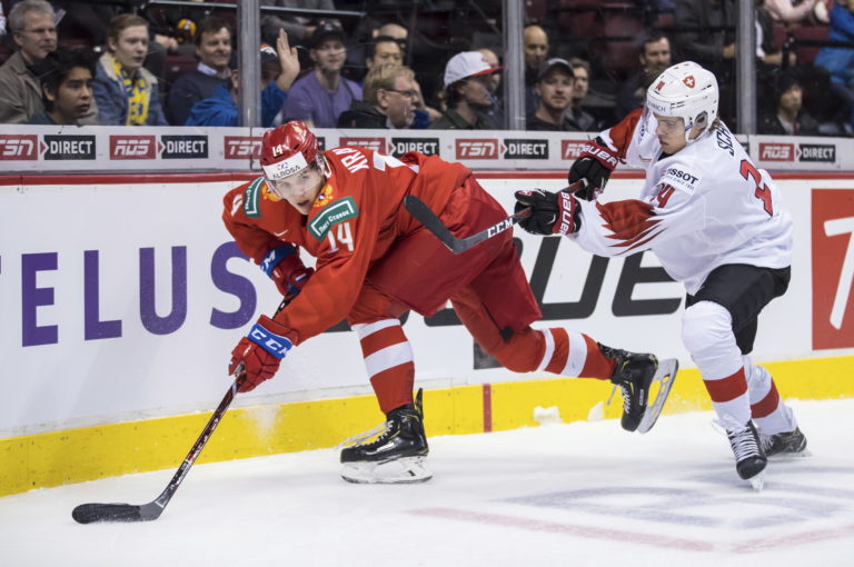 Ruský hokejista Vitali Kravtsov (vľavo) v súboji s hráčom Švajčiarska Sandro Schmidom v zápase o bronz na MS v hokeji do 20 rokov, Vancouver, Kanada, 5. január 2019.