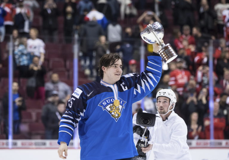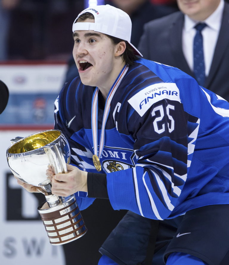 Fínsky kapitán Aarne Talvitie drží v rukách trofej po víťazstve nad USA vo finále MS v hokeji do 20 rokov, Vancouver, Kanada, 5. január 2019.