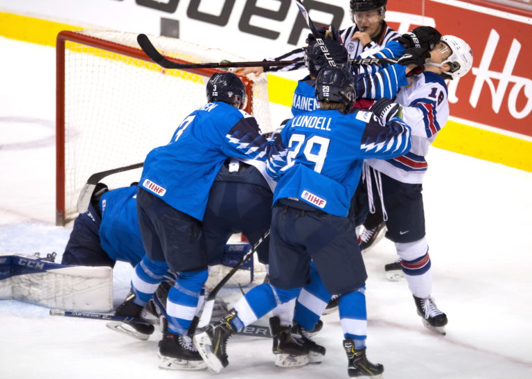 Menšia potýčka hráčov Fínska a USA vo finále MS v hokeji do 20 rokov, Vancouver, Kanada, 5. január 2019.
