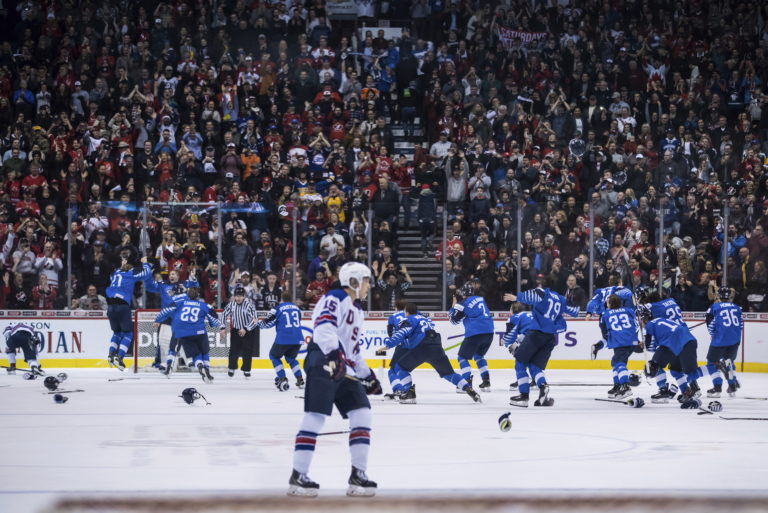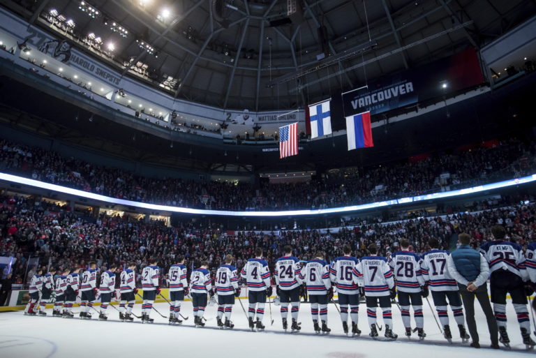 Hráči USA počas fínskej hymny po finále MS v hokeji do 20 rokov, Kanada, Vancouver, 5. január 2019.