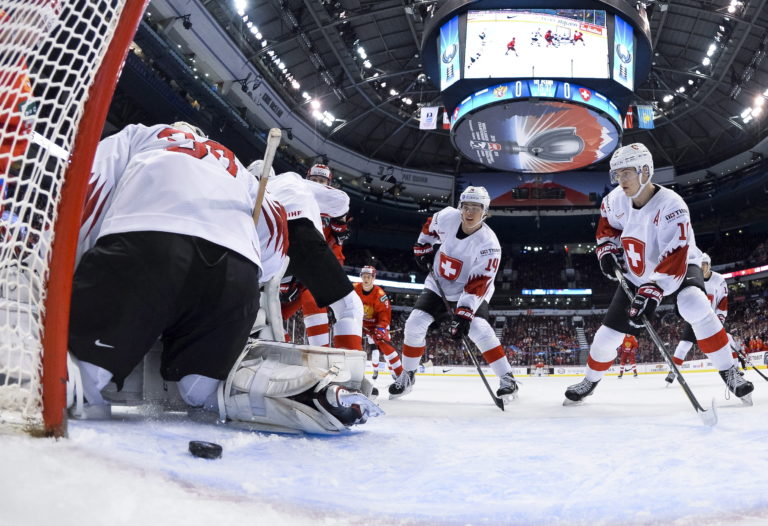 Švajčiarsky brankár Luca Hollenstein a spoluhráči Sandro Schmid a Matthew Verboon sledujú, či sa puk dostane do bránky v zápase o bronz na MS v hokeji do 20 rokov, Vancouver, Kanada, 5. január 2019.
