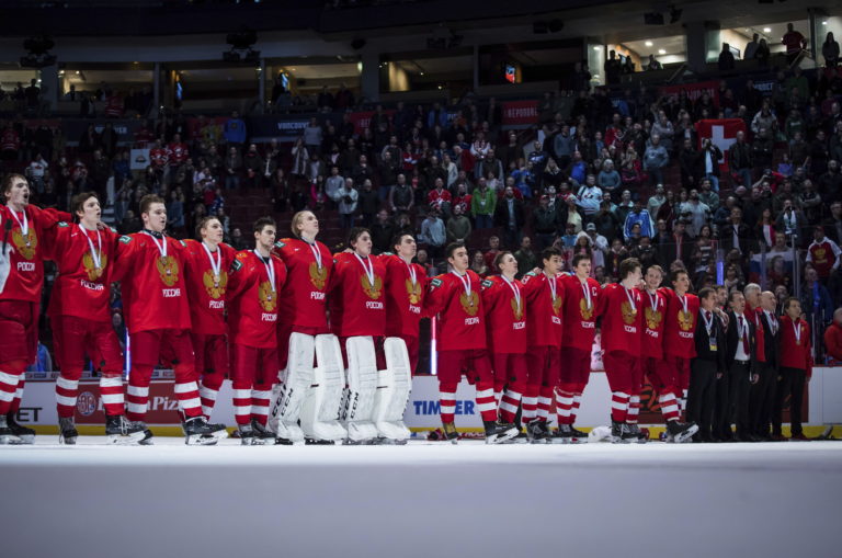 Ruskí hráči spievajú národnú hymnu po víťazstve nad Švajčiarskom v zápase o bronz na MS v hokeji do 20 rokov, Vancouver, Kanada, 5. január 2019.