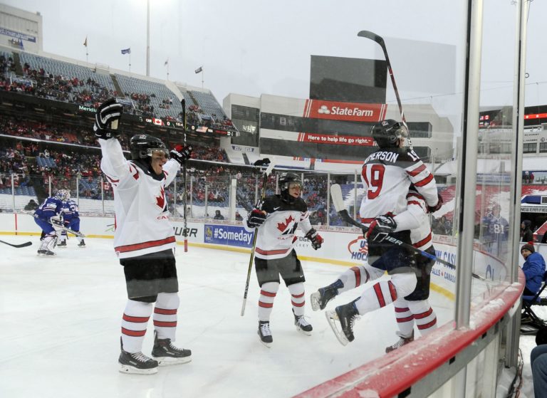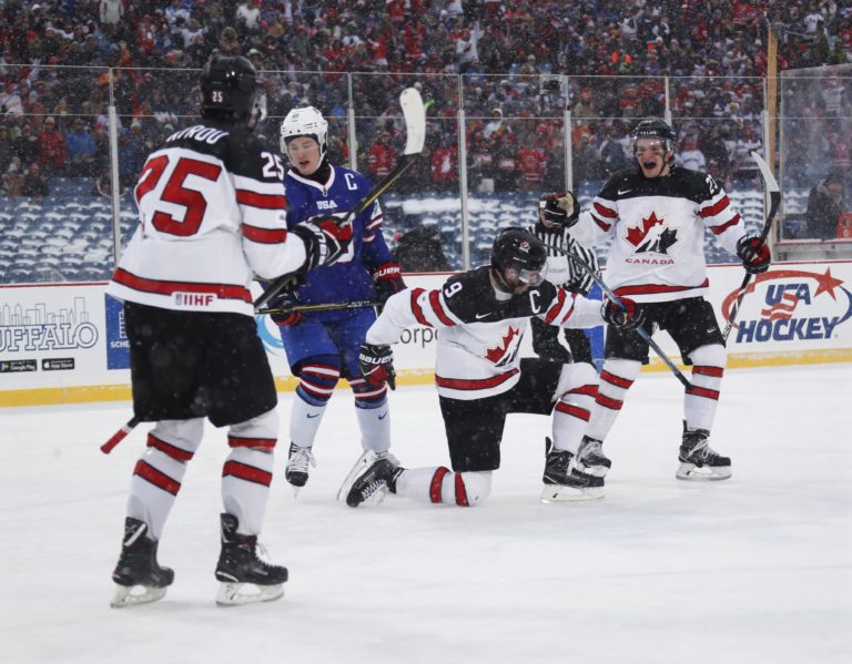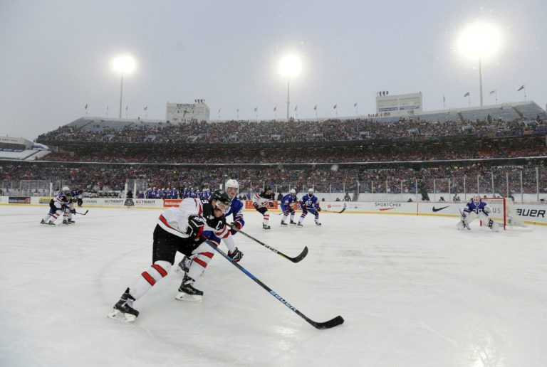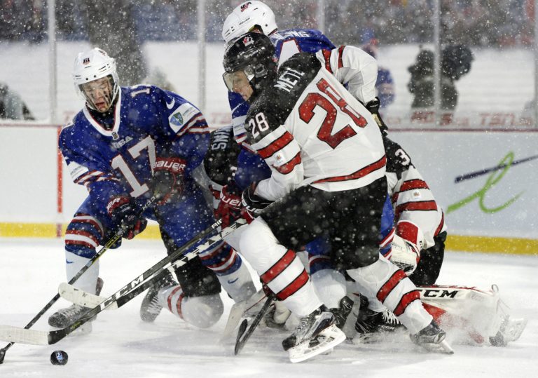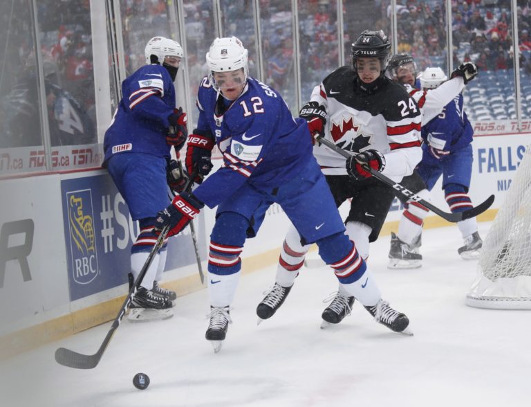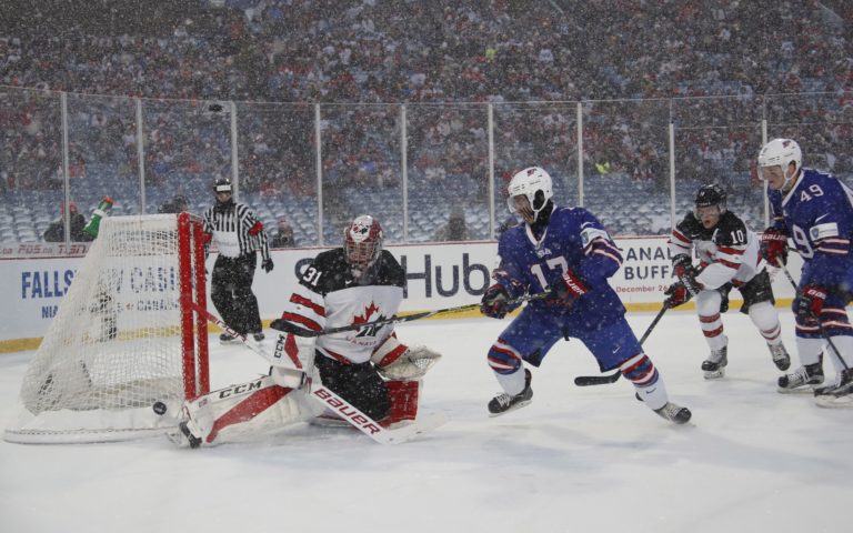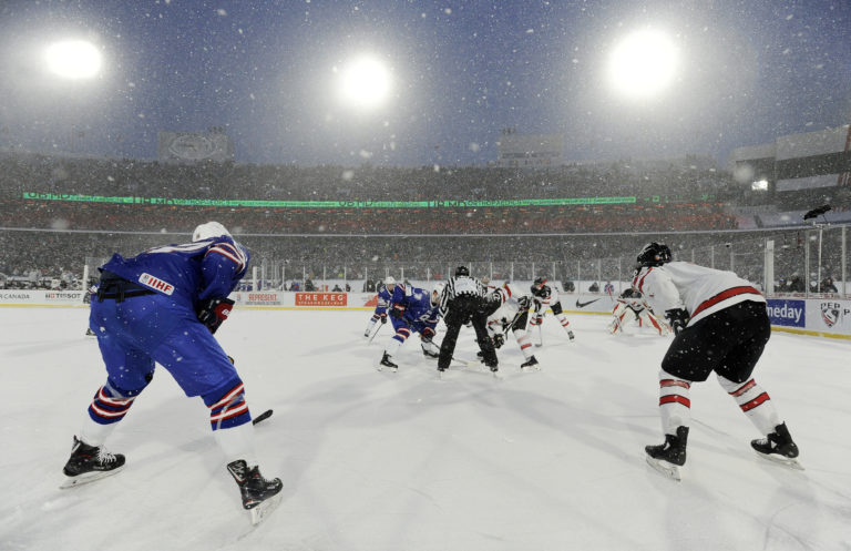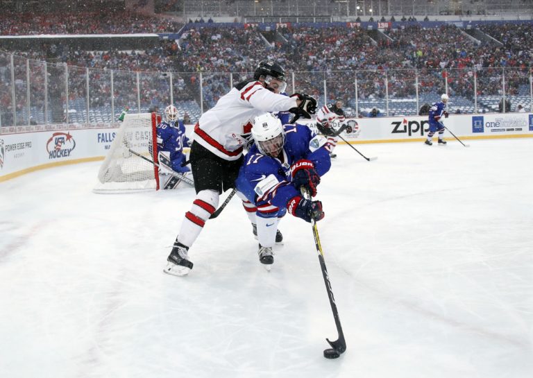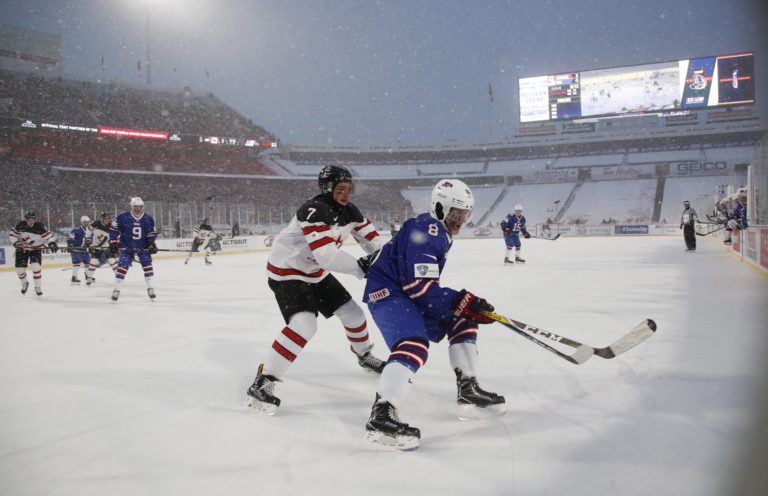 Zápas pod holým nebom medzi Kanadou a Spojenými štátmi počas majstrovstiev sveta hokejistov do 20 rokov v Buffale. 29. december 2017 Foto: Mark Blinch/The Canadian Press via AP.