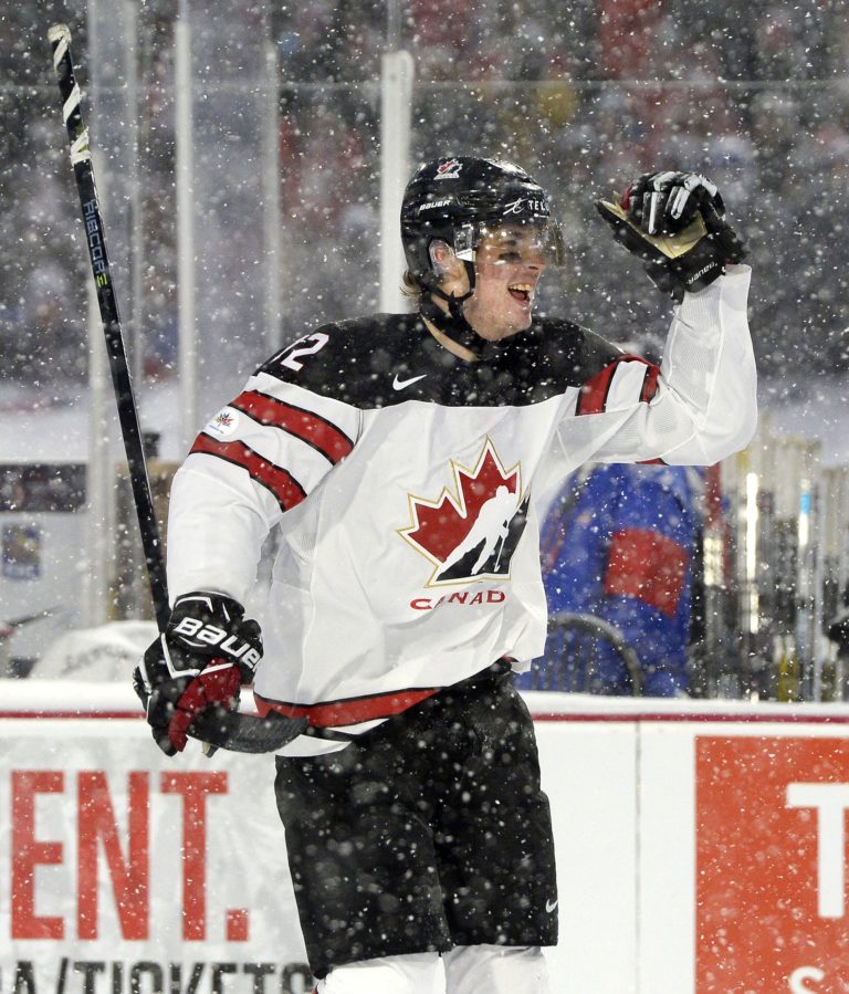 Kanadský útočník Boris Katchouk (12) sa teší z gólu v sieti USA počas zápasu Winter Classic pod holým nebom na MS v hokeji do 20 rokov. Buffalo, 29. december 2017. Foto: SITA/AP.