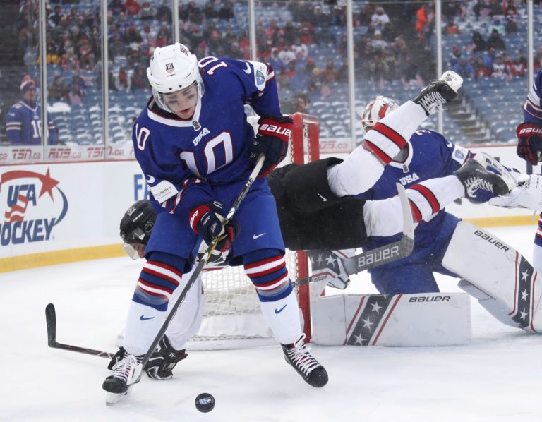 Kanadský útočník Drake Batherson padá po súboji s Američanom Willom Lockwoodom počas zápasu Winter Classic pod holým nebom na MS v hokeji do 20 rokov. Buffalo, 29. december 2017. Foto: Mark Blinch/The Canadian Press via AP.