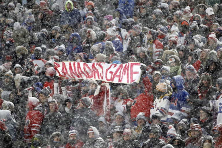 Fanúšikovia počas zápasu Winter Classic pod holým nebom medzi Kanadou a USA na MS v hokeji do 20 rokov. Buffalo, 29. december 2017. Foto: Mark Blinch/The Canadian Press via AP.