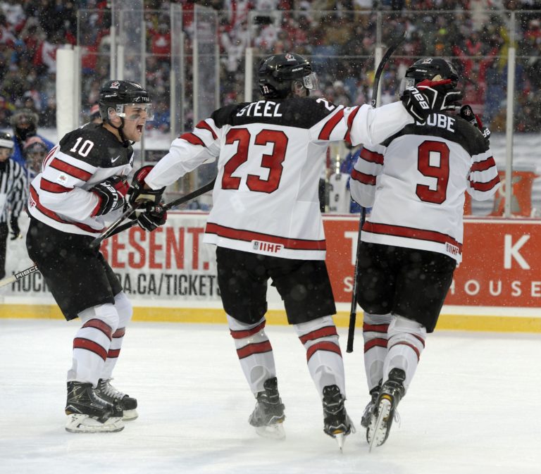 Kanadský kapitán Dillon Dube (9) sa teší z gólu v sieti USA počas zápasu Winter Classic pod holým nebom na MS v hokeji do 20 rokov. Buffalo, 29. december 2017. Foto: Mark Blinch/The Canadian Press via AP.