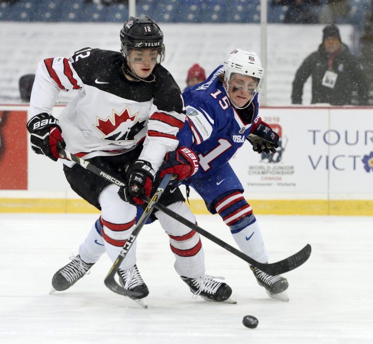 Kanadský útočník Dillon Dube v súboji s Američanom Kailerom Yamamotom (17) počas zápasu na MS v hokeji do 20 rokov. Buffalo, 29. december 2017. Foto: Mark Blinch/The Canadian Press via AP.