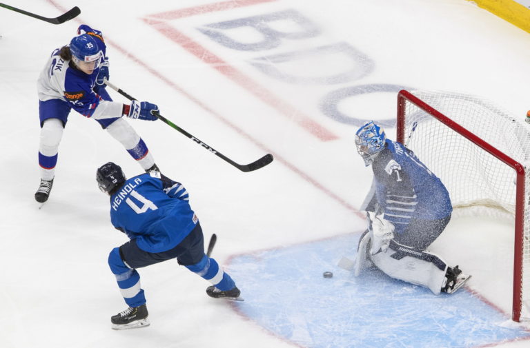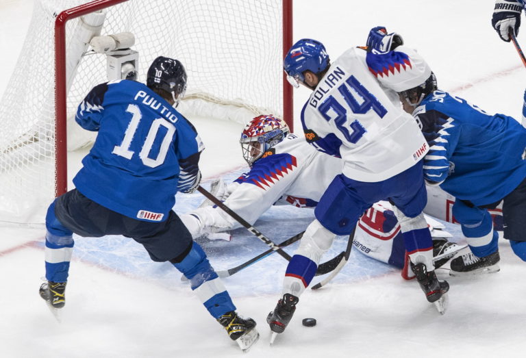 Zákrok slovenského gólmana Samuela Hlavaja po zakončení Fína Kaspera Puutioha (10) počas zápasu A-skupiny na MS v hokeji do 20 rokov. Edmonton (Rogers Place), 30. december 2020. Foto: Jason Franson/The Canadian Press via AP.