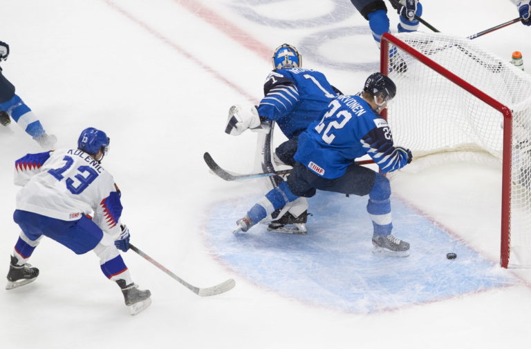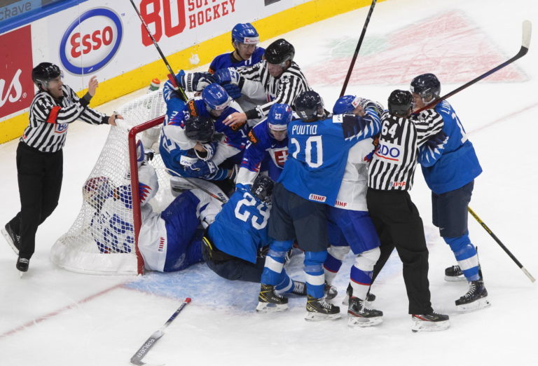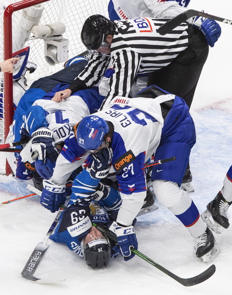 Šarvátka v bránkovisku gólmana Samuela Hlavaja počas zápasu A-skupiny na MS v hokeji do 20 rokov medzi Slovenskom a Fínskom. Edmonton (Rogers Place), 30. december 2020. Foto: Jason Franson/The Canadian Press via AP.