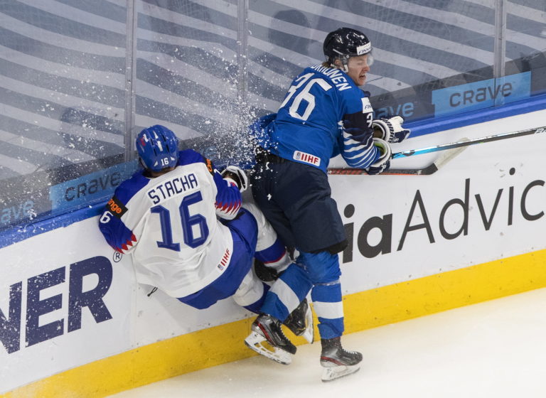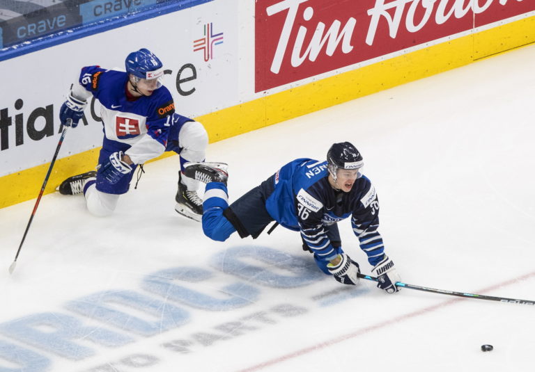 Slovenský obranca Marko Stacha padá po súboji s Fínom Benjaminom Korhonenom (36) počas zápasu A-skupiny na MS v hokeji do 20 rokov. Edmonton (Rogers Place), 30. december 2020. Foto: Jason Franson/The Canadian Press via AP.