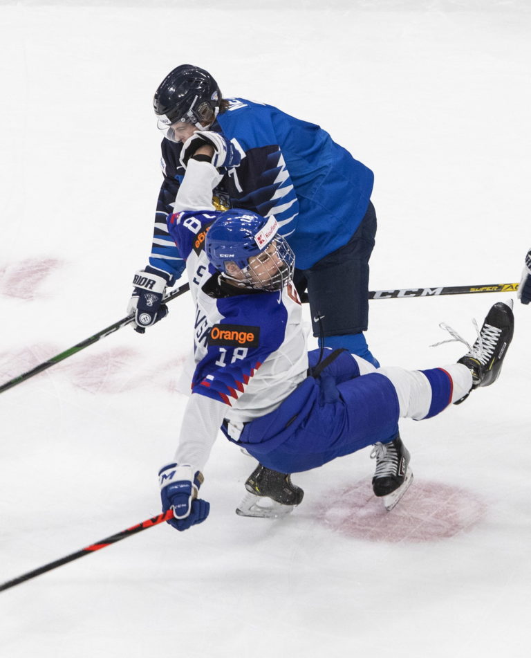 Slovenský útočník Dominik Jendek padá po súboji s Fínom Benjaminom Korhonenom (36) počas zápasu A-skupiny na MS v hokeji do 20 rokov. Edmonton (Rogers Place), 30. december 2020. Foto: Jason Franson/The Canadian Press via AP.
