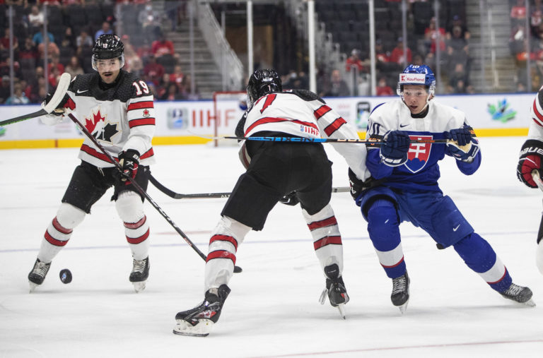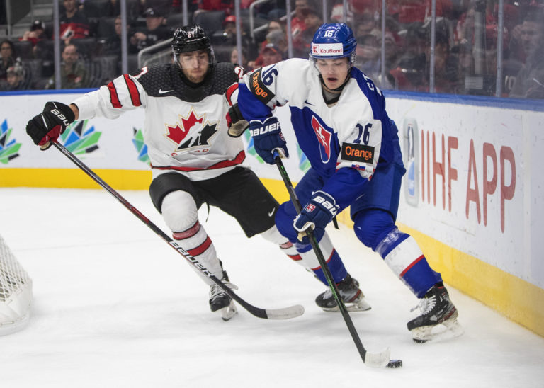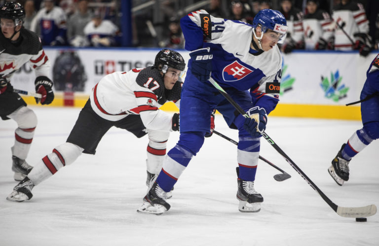 Kanaďan Ridly Grieg sa snaží zastaviť slovenského útočníka Maroša Jedličku počas zápasu A-skupiny na MS v hokeji do 20 rokov. Edmonton (Rogers Place), 11. august 2022. Foto: Jason Franson/The Canadian Press via AP.