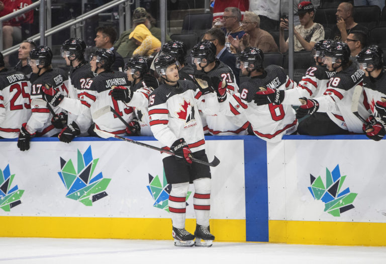 Kanadský útočník Brennan Othmann sa teší z gólu v sieti Slovenska počas zápasu A-skupiny na MS v hokeji do 20 rokov. Edmonton (Rogers Place), 11. august 2022. Foto: Jason Franson/The Canadian Press via AP.