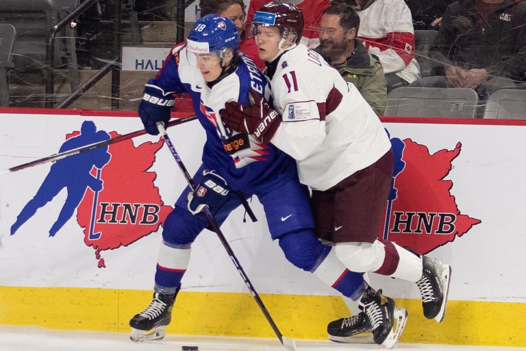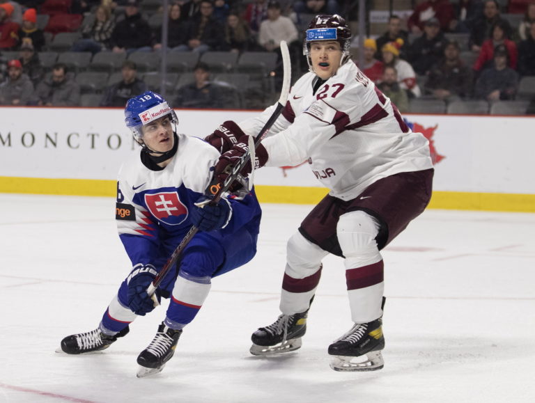 Servác Petrovský zo Slovenska (vľavo) a Klas Veinbergs z Lotyšska počas zápasu B-skupiny na MS v hokeji do 20 rokov. Moncton, 30. december 2022. Foto: Ron Ward/The Canadian Press/AP