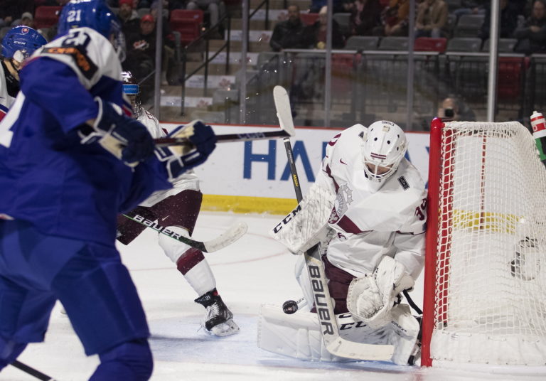 Brankár Patriks Berzins z Lotyšska chytá puk počas zápasu B-skupiny na MS v hokeji do 20 rokov proti Slovensku. Moncton, 30. december 2022. Foto: Ron Ward/The Canadian Press/AP