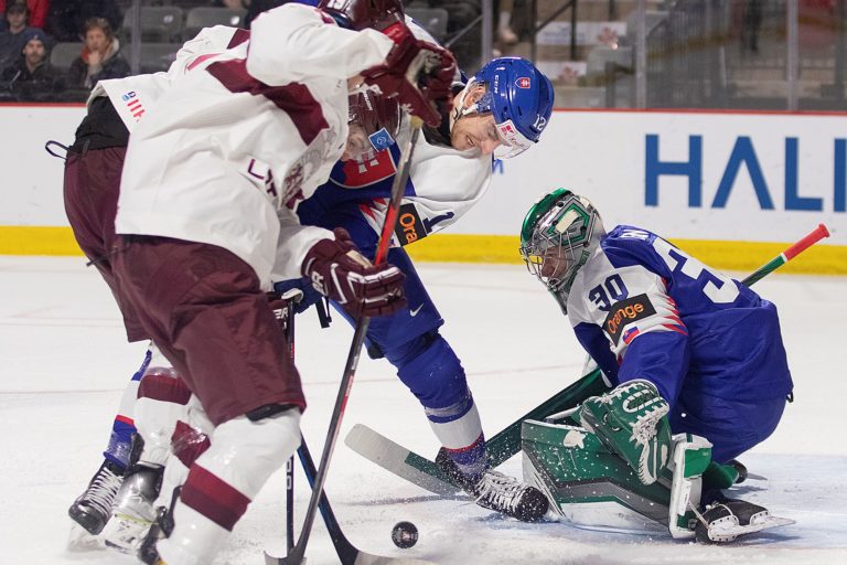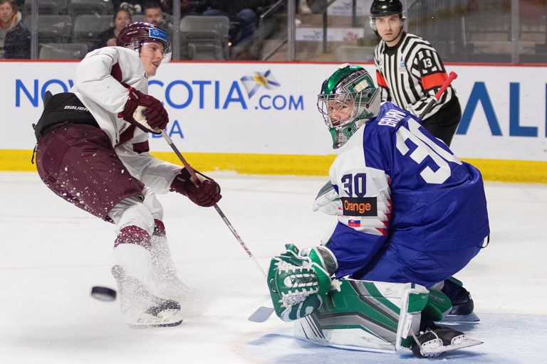 Brankár Adam Gajan zo Slovenska (vpravo) likviduje šancu Dansa Locmelisa z Lotyšska počas zápasu B-skupiny na MS v hokeji do 20 rokov. Moncton, 30. december 2022. Foto: Ron Ward/The Canadian Press/AP