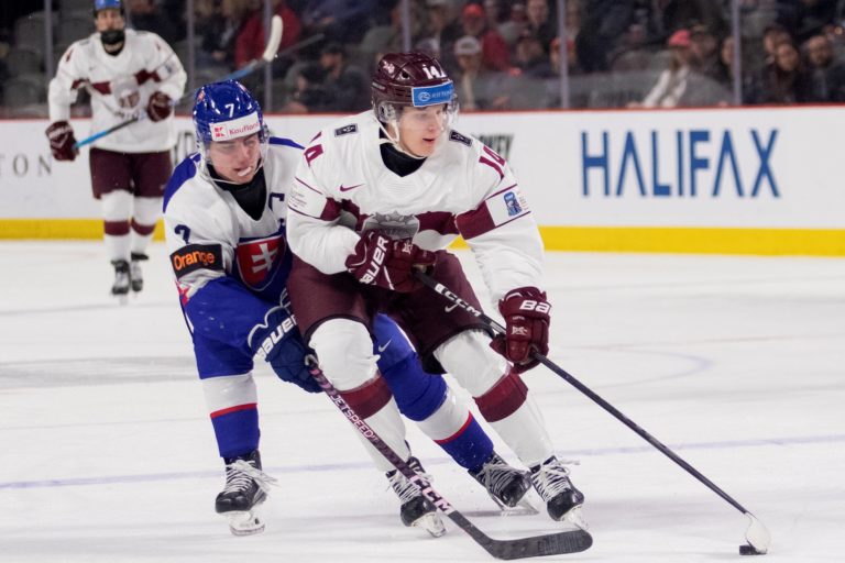 Adam Sýkora zo Slovenska (vpravo) strieľa na bránku Lotyšska počas zápasu B-skupiny na MS v hokeji do 20 rokov. Moncton, 30. december 2022. Foto: archívne, Ron Ward/The Canadian Press/AP