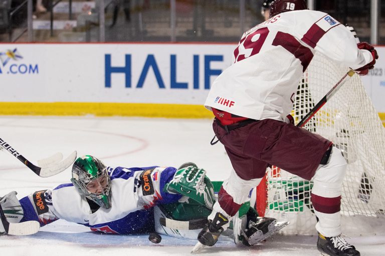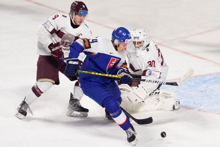 Brankár Adam Gajan zo Slovenska (vľavo) likviduje dorážku Darelsa Dukursa z Lotyšska počas zápasu B-skupiny na MS v hokeji do 20 rokov. Moncton, 30. december 2022. Foto: Ron Ward/The Canadian Press/AP
