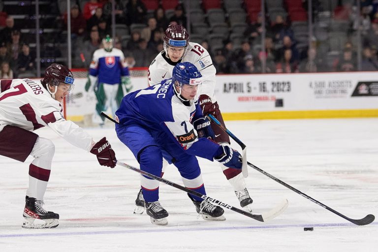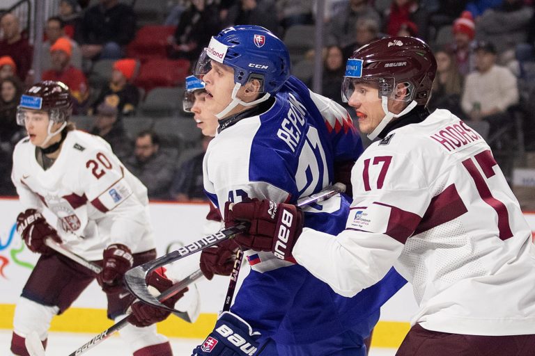 Peter Repčík zo Slovenska (v strede) krosčekovaný Bogdansom Hodassom z Lotyšska počas zápasu B-skupiny na MS v hokeji do 20 rokov. Moncton, 30. december 2022. Foto: Ron Ward/The Canadian Press/AP