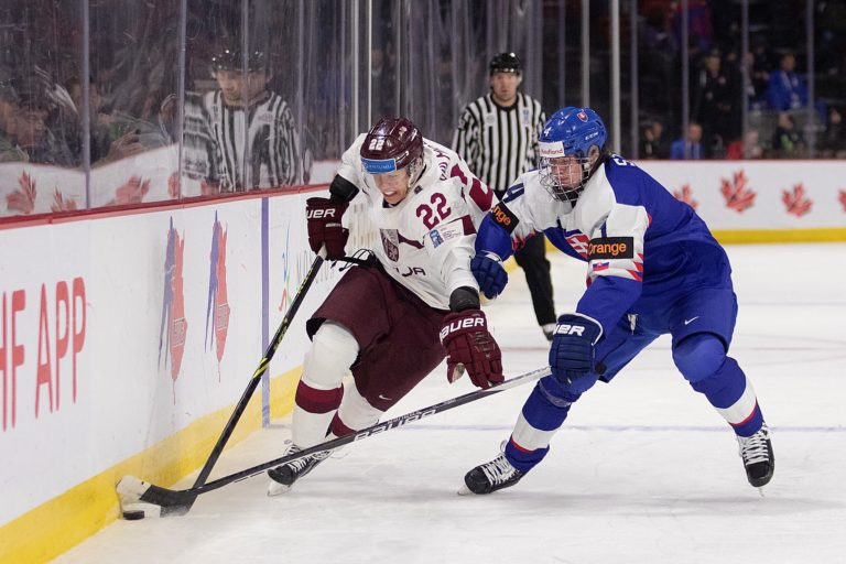 Maxim Štrbák zo Slovenska (vpravo) sa snaží zastaviť Sandisa Vilmanisa z Lotyšska počas zápasu B-skupiny na MS v hokeji do 20 rokov. Moncton, 30. december 2022. Foto: Ron Ward/The Canadian Press/AP