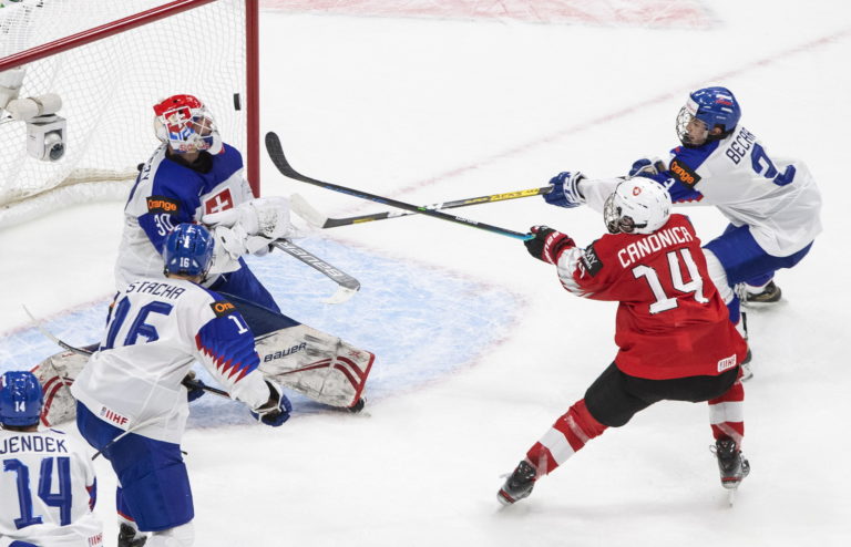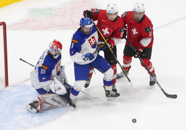 Slovenský obranca Šimon Bečár v súboji so Švajčiarmi Stefanom Bottinim (20) a Lorenzom Canonicom (14) pred brankárom Šimonom Latkóczym počas zápasu A-skupiny na MS v hokeji do 20 rokov proti Švajčiarsku. Edmonton (Rogers Place), 25. december 2020. Foto: Jason Franson/The Canadian Press via AP.