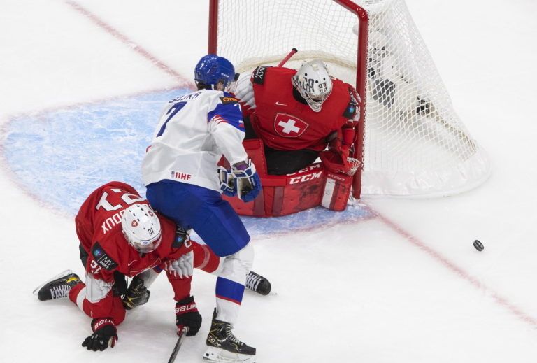 Zákrok švajčiarskeho gólmana Thibaulta Fattona (29) po zakončení Slováka Dominika Sojku počas zápasu A-skupiny na MS v hokeji do 20 rokov proti Švajčiarsku. Edmonton (Rogers Place), 25. december 2020. Foto: Jason Franson/The Canadian Press via AP.