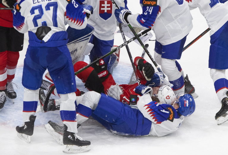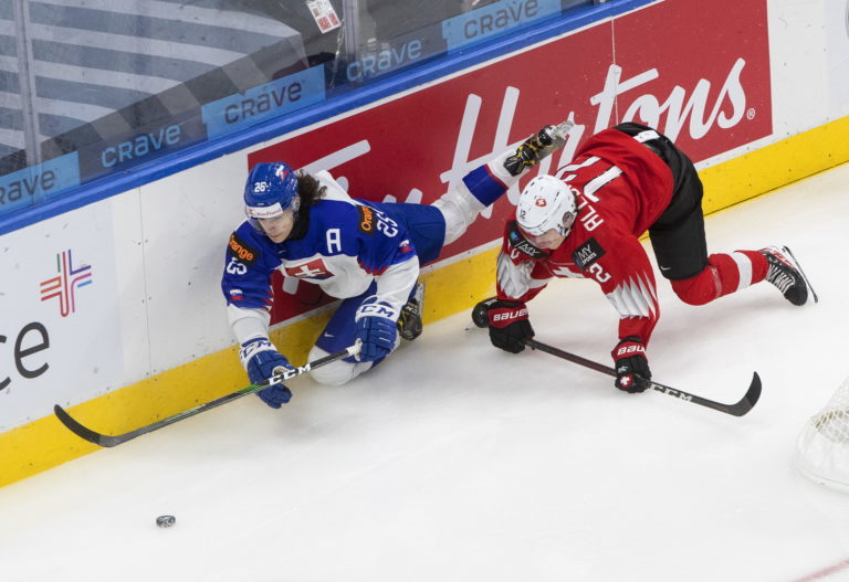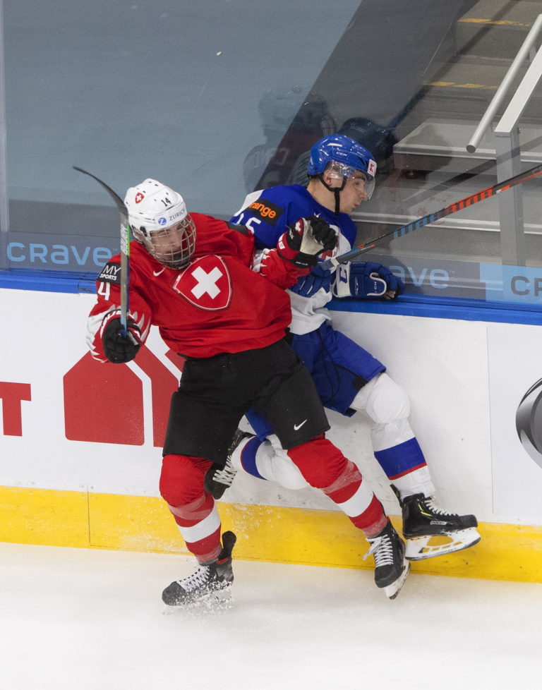 Švajčiarsky reprezentant Nathan Vouardoux (21) v súboji so Slovákom Matejom Kašlíkom počas zápasu A-skupiny na MS v hokeji do 20 rokov. Edmonton (Rogers Place), 25. december 2020. Foto: Jason Franson/The Canadian Press via AP.