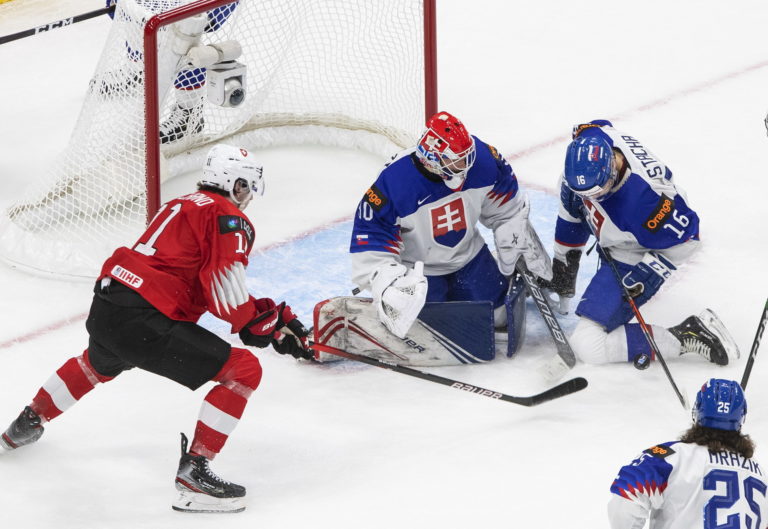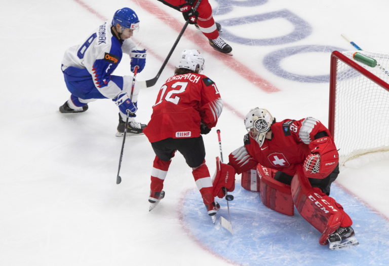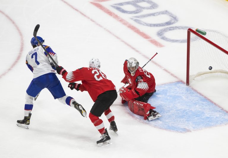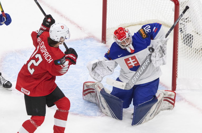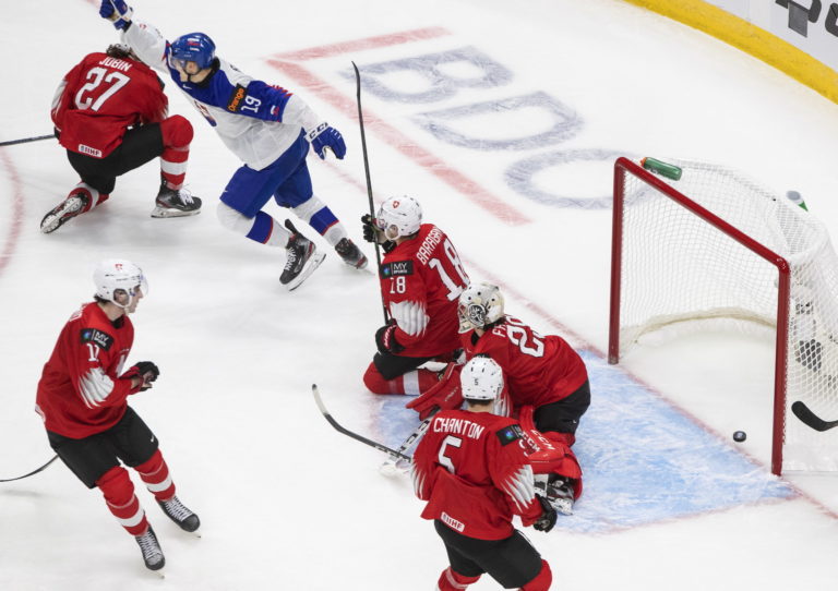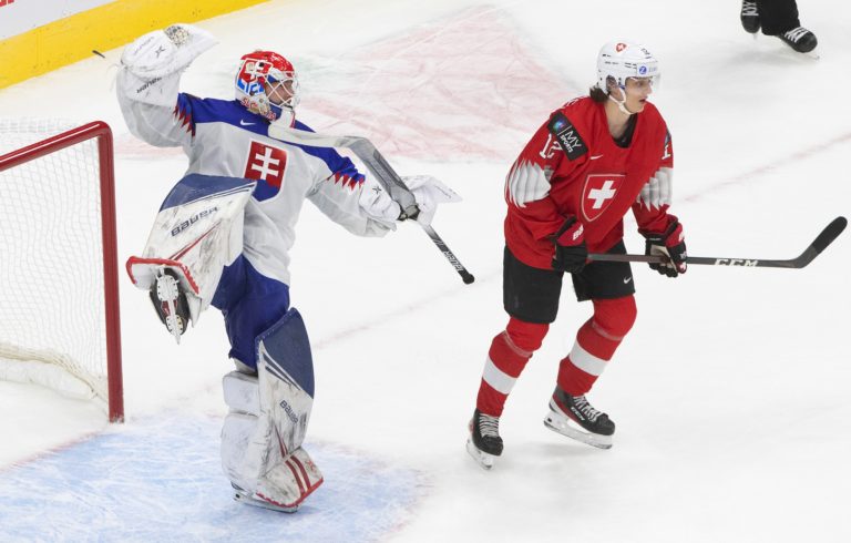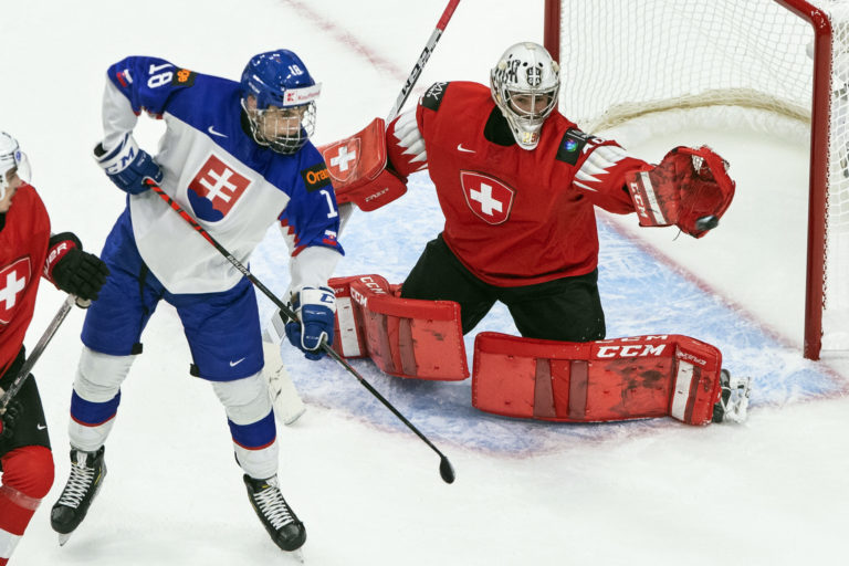 Zákrok švajčiarskeho brankára Thibaulta Fattona (29) počas zápasu A-skupiny na MS v hokeji do 20 rokov proti Slovensku. Edmonton (Rogers Place), 25. december 2020. Foto: Jason Franson/The Canadian Press via AP.