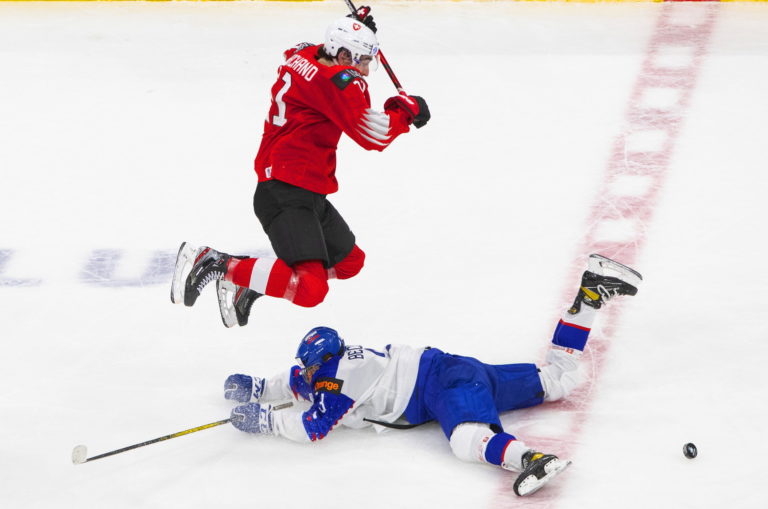 Švajčiarsky reprezentant Lorenzo Canonica (14) v súboji so Slovákom Markom Stachom počas zápasu A-skupiny na MS v hokeji do 20 rokov. Edmonton (Rogers Place), 25. december 2020. Foto: Jason Franson/The Canadian Press via AP.