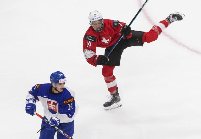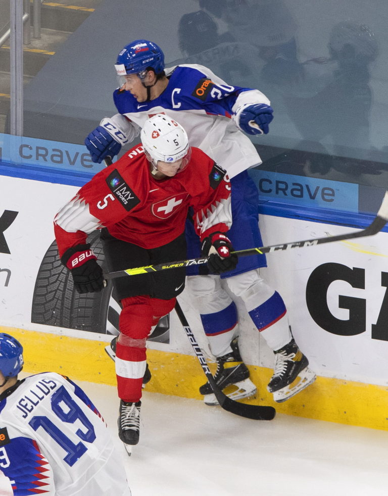Švajčiarsky reprezentant Lorenzo Canonica (14) a Slovák Dominik Jendek počas zápasu A-skupiny na MS v hokeji do 20 rokov proti Švajčiarsku. Edmonton (Rogers Place), 25. december 2020. Foto: Jason Franson/The Canadian Press via AP.