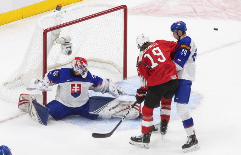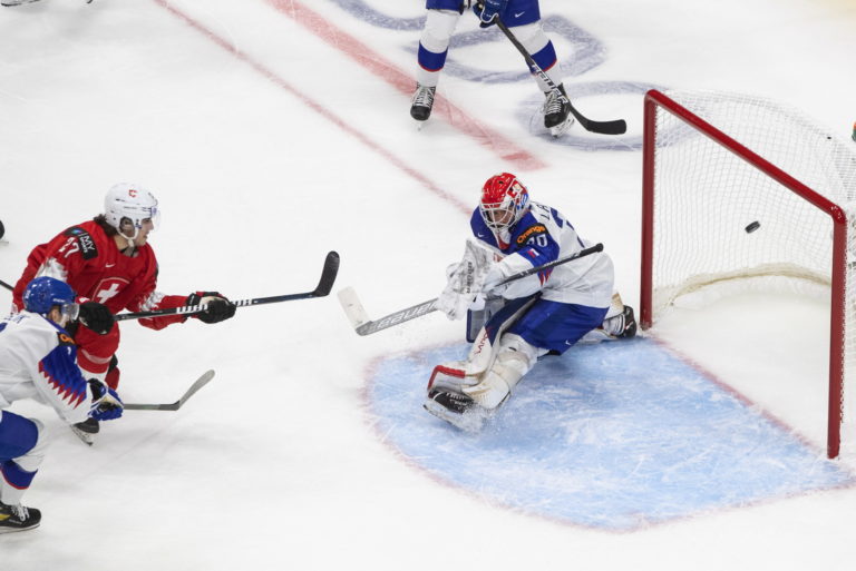 Jeden zo zákrokov slovenského brankára Šimona Latkóczyho počas zápasu A-skupiny na MS v hokeji do 20 rokov proti Švajčiarsku. Edmonton (Rogers Place), 25. december 2020. Foto: Jason Franson/The Canadian Press via AP.