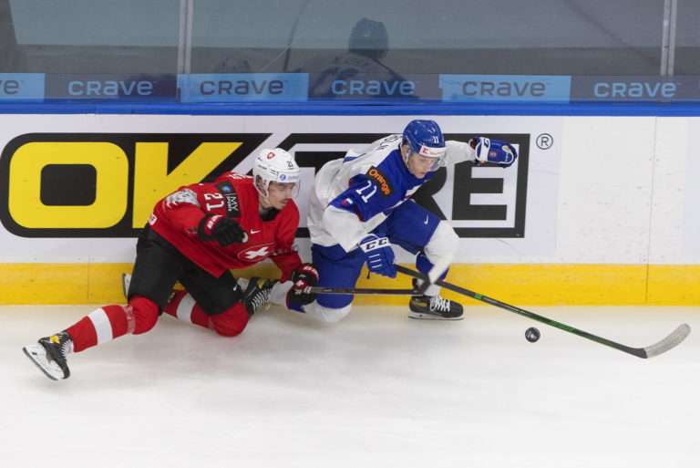 Zľava: Slovenský reprezentant Jakub Kolenič a Švajčiar reprezentant Simon Knak (8) počas zápasu A-skupiny na MS v hokeji do 20 rokov. Edmonton (Rogers Place), 25. december 2020. Foto: Jason Franson/The Canadian Press via AP.