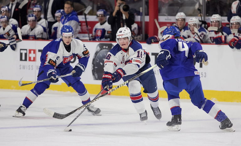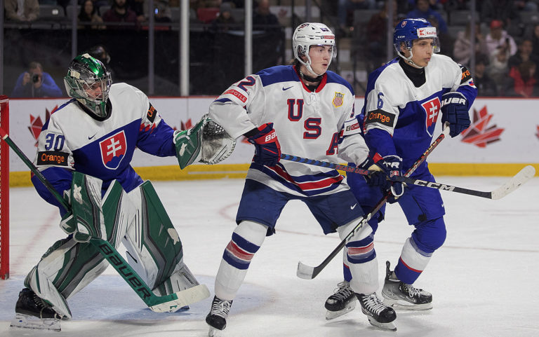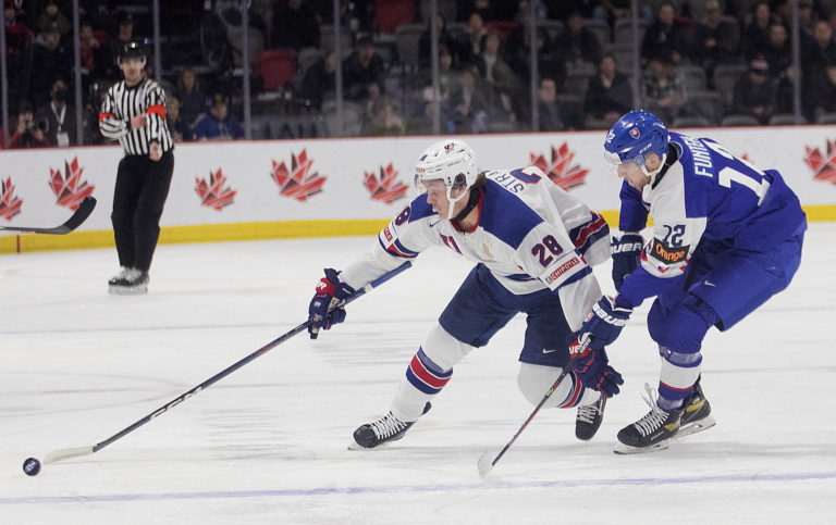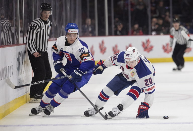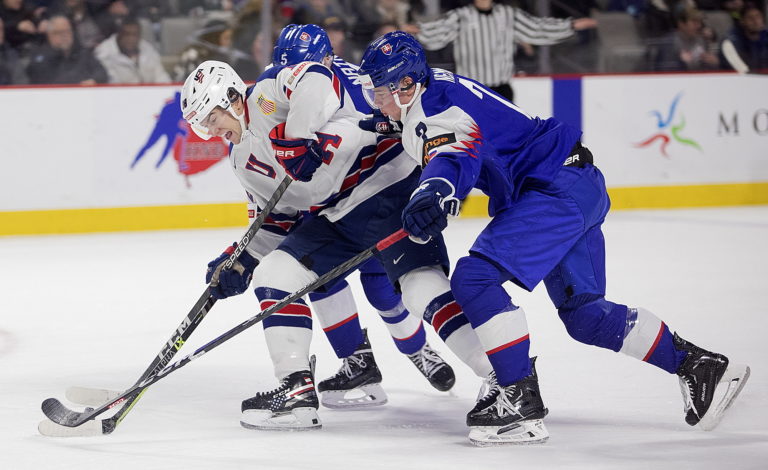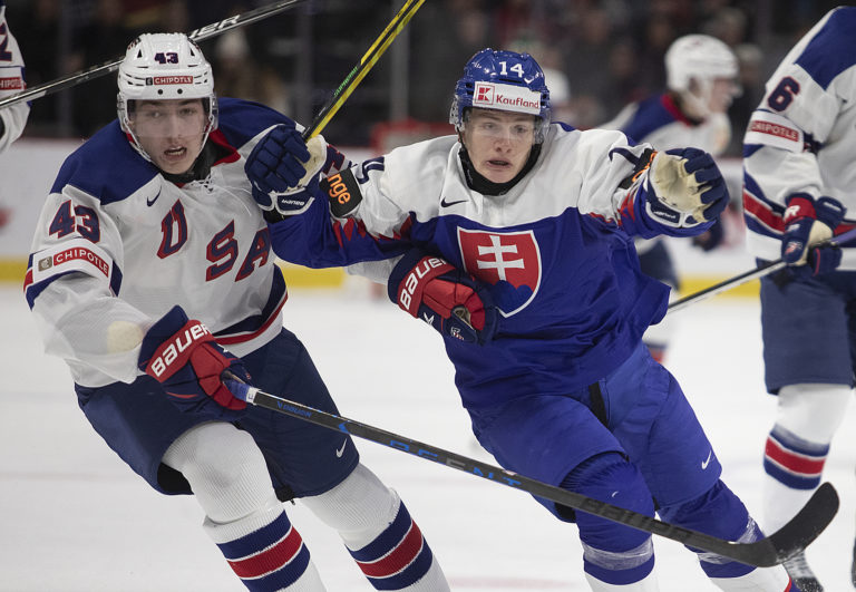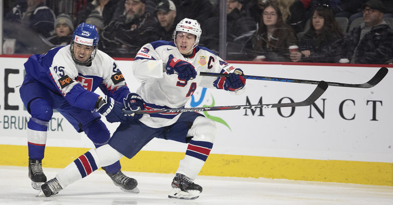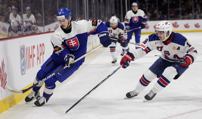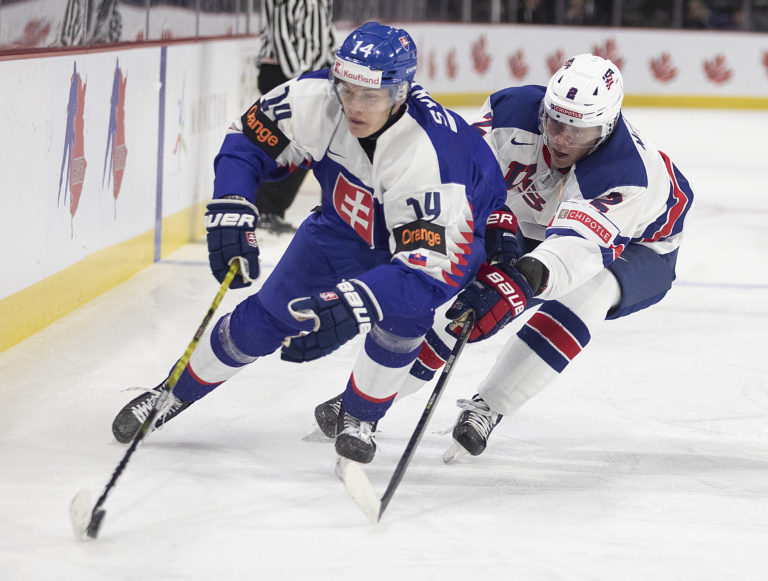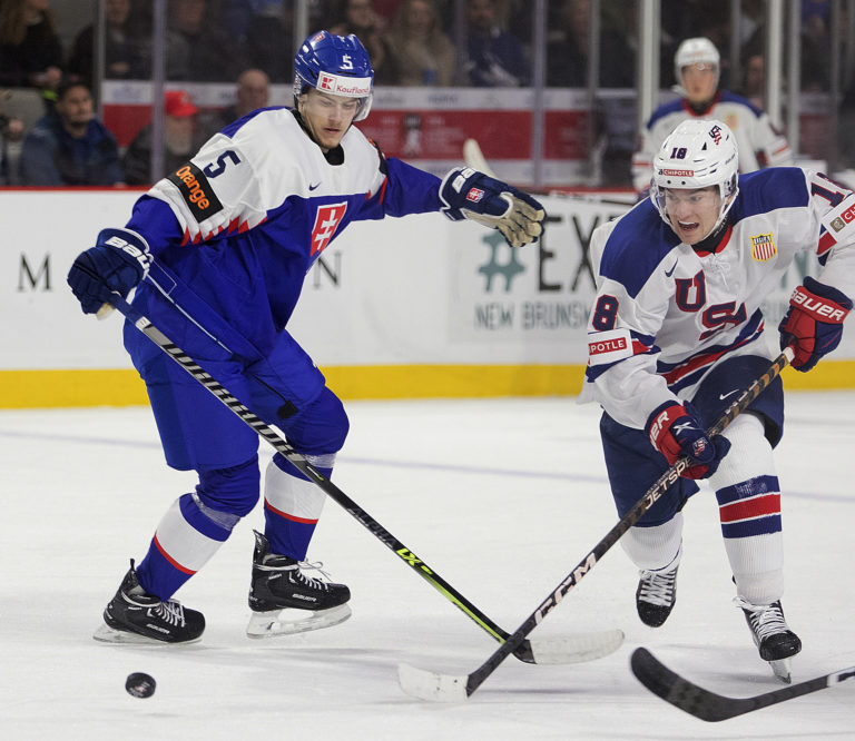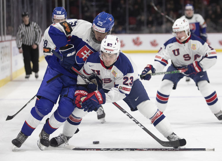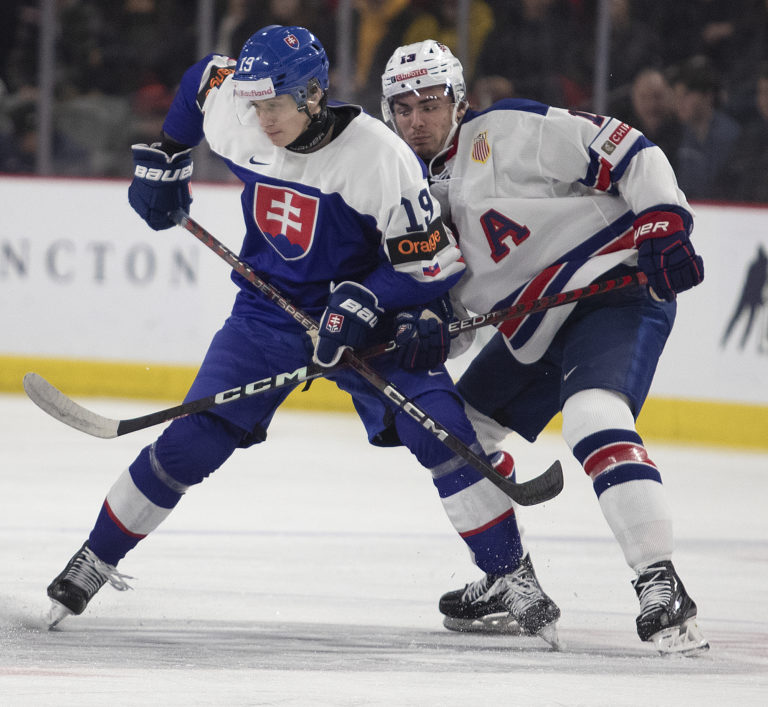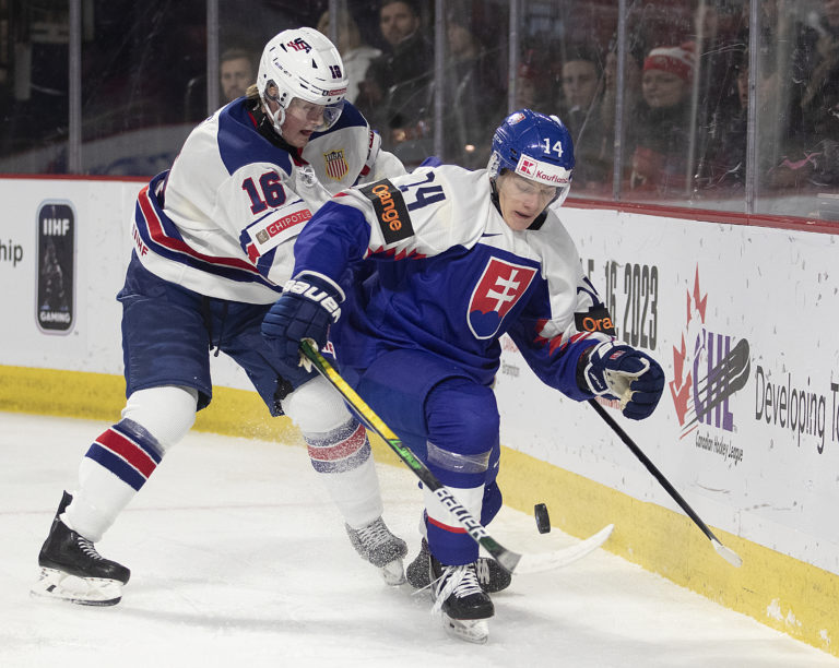 Americký kapitán Luke Hughes a slovenský útočník František Dej počas zápasu B-skupiny na MS v hokeji do 20 rokov. Moncton (Avenir Centre), 28. december 2022. Foto: Ron Ward/The Canadian Press via AP.