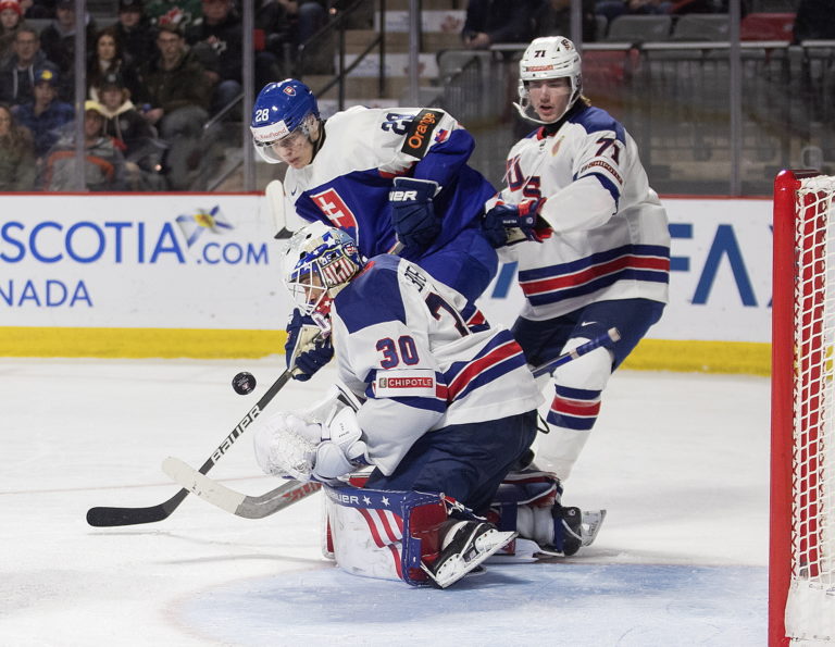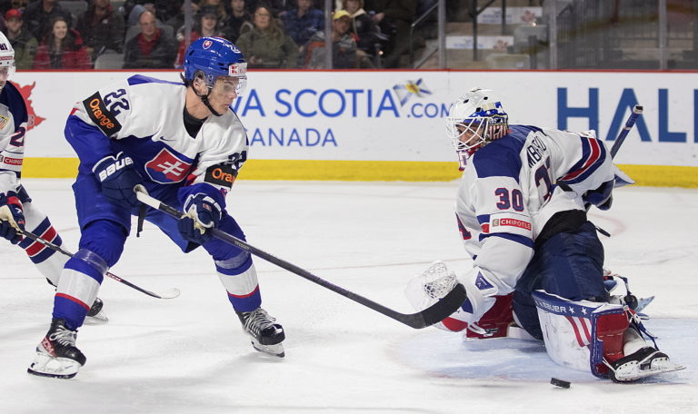 Zákrok amerického brankára Kaidana Mbereka po zakončení slovenského útočníka Alexa Čiernika počas zápasu B-skupiny na MS v hokeji do 20 rokov. Moncton (Avenir Centre), 28. december 2022. Foto: Ron Ward/The Canadian Press via AP.