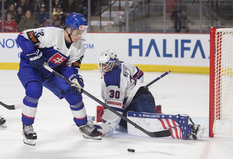 Slovenský útočník Alex Šotek sa snaží tečovať puk pred americkým brankárom Kaidanom Mberekom počas zápasu B-skupiny na MS v hokeji do 20 rokov. Moncton (Avenir Centre), 28. december 2022. Foto: Ron Ward/The Canadian Press via AP.